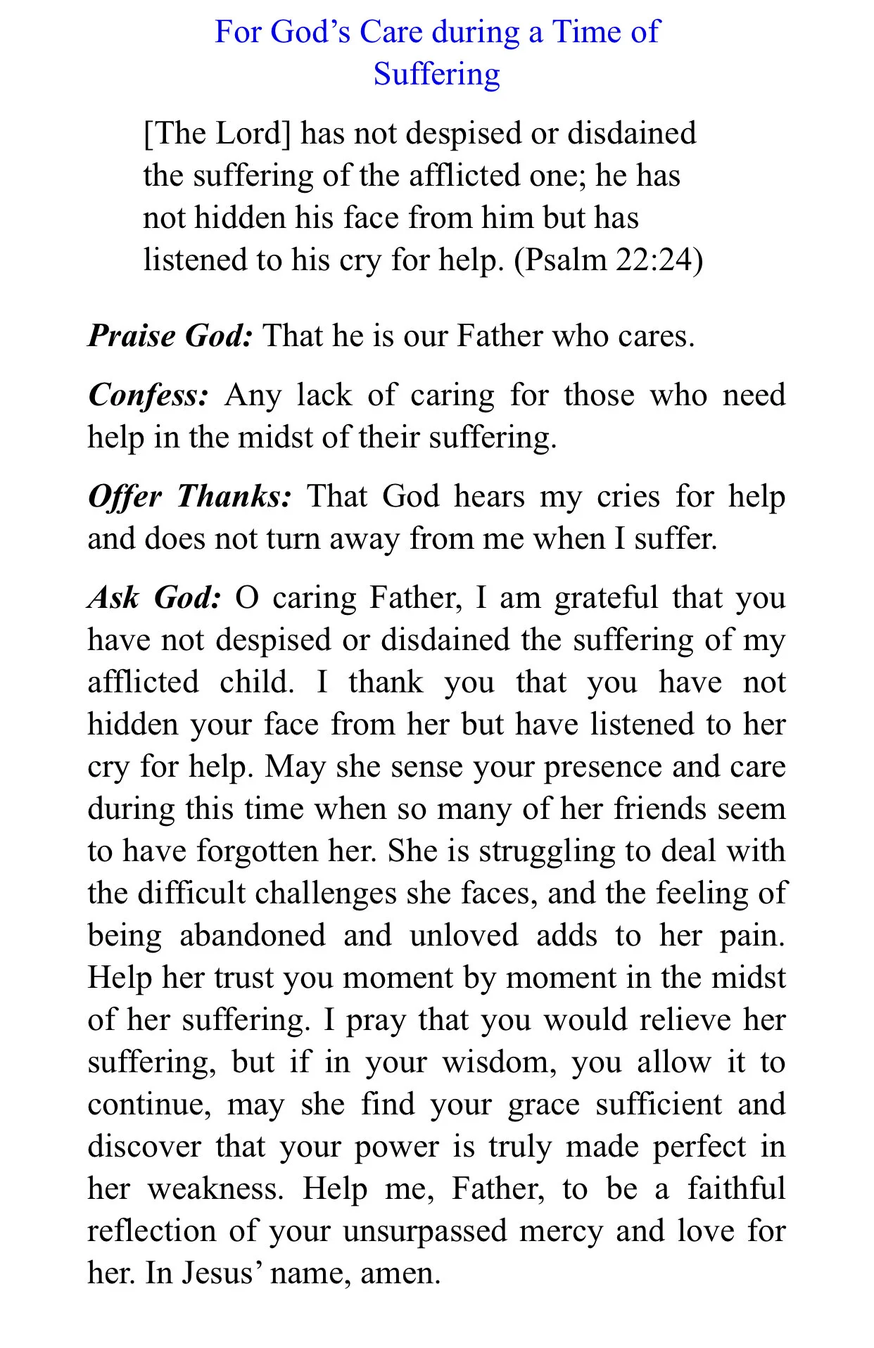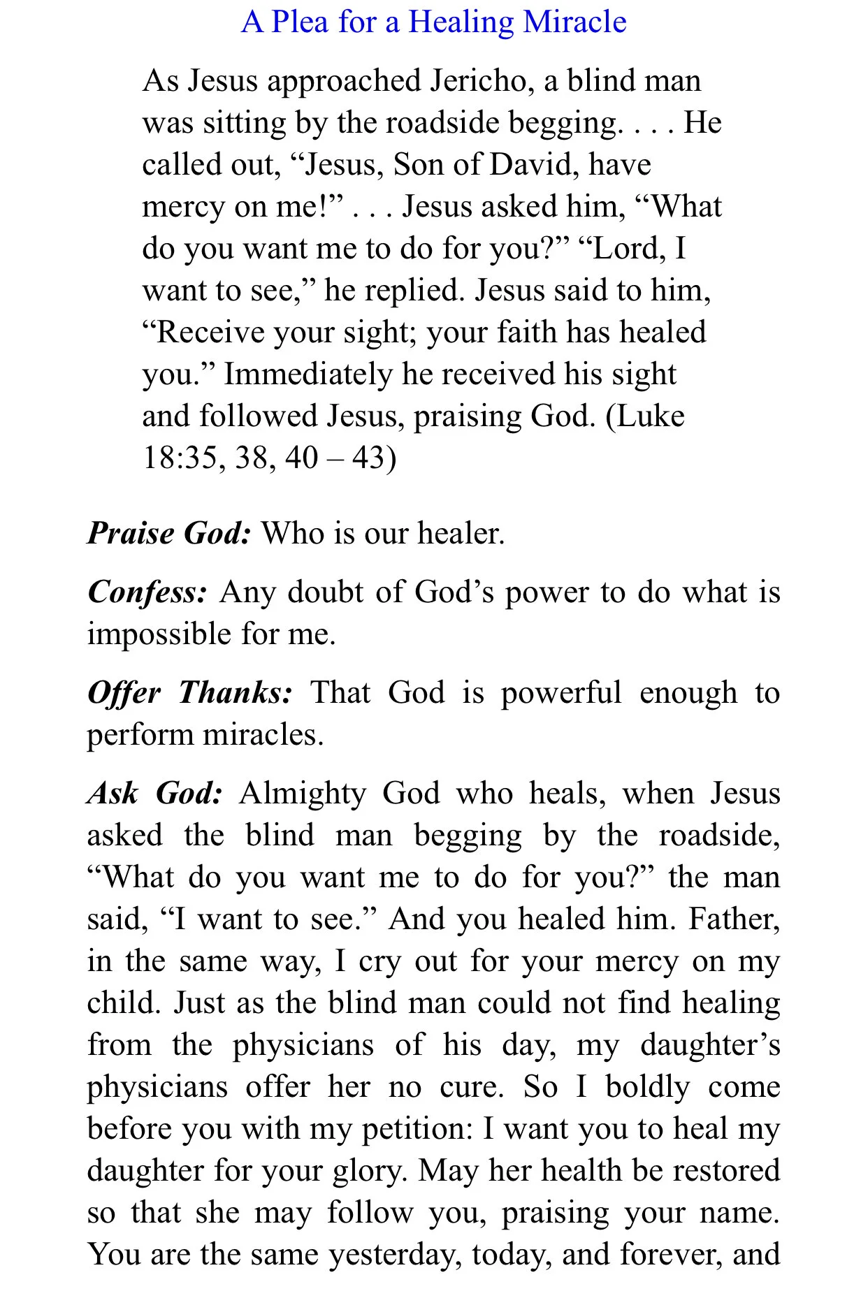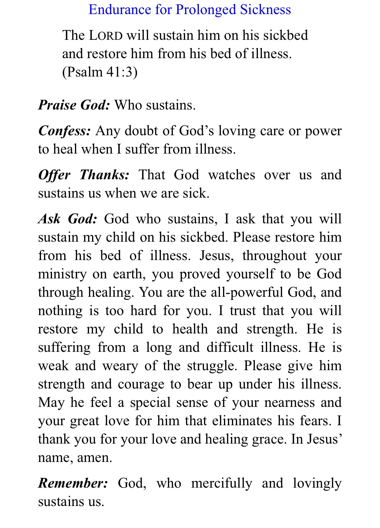 Ask God: O blessed Great Physician, you are the Lord who heals. I ask you to heal my child. By the power of your great mercy, provide strength as he fights the daily challenges of this illness. Help him to be courageous and not become discouraged. I pray for your healing power to touch his body so that he will enjoy good health once again. During this time of sickness, I ask you to strengthen his inner spirit and make him more like Jesus. Please use this affliction to help him become a more compassionate, caring person who is quick to pray for others who are sick. I ask that you would grant the doctors wisdom, understanding, and compassion in treating my child. Please help him sleep peacefully knowing that he is in the palm of your hand and that you will never leave him or forsake him. In Jesus’ name, amen.